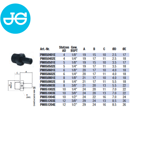 Startseite » John Guest » John Guest PM Serie » Einschraubstutzen BSPT » Einschraubstutzen PM050402E - Ø 4,00 mm x 1/4"